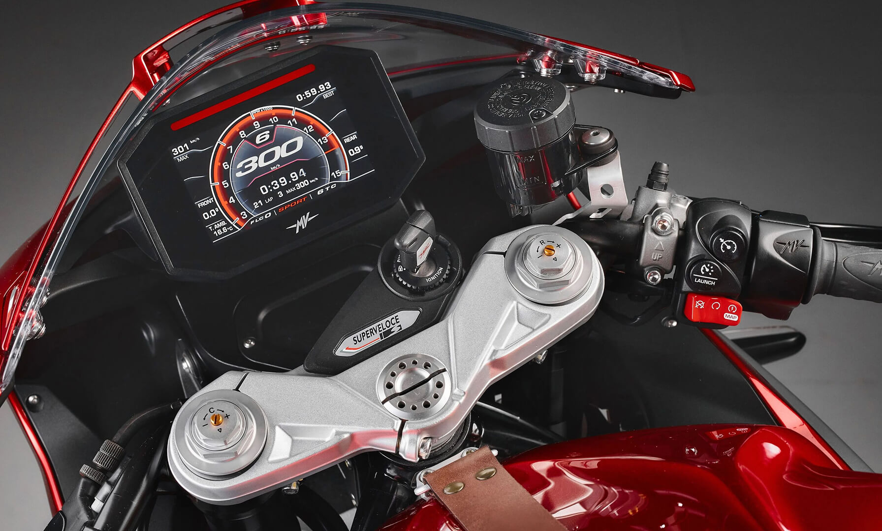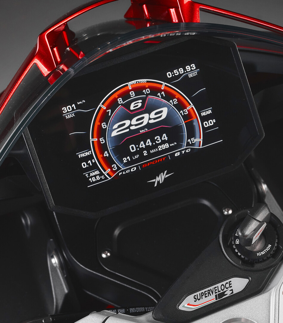 A eletrónica da Superveloce S utiliza uma avançada plataforma inercial de 6 eixos, que fornece todos os dados necessários para o funcionamento eficiente de vários sistemas de controlo com base no ângulo de inclinação e noutros parâmetros. Esta integração assegura que segurança e desempenho estão intrinsecamente ligados. O sistema ABS inclui função em curva para reforçar a segurança mesmo em inclinação, enquanto o controlo de tração intervém com elevada precisão, tendo também em conta o ângulo de inclinação da moto. Adicionalmente, o Front Lift Control FLC e o Launch Control estão disponíveis na Superveloce. Adicionalmente, o Front Lift Control FLC e o Launch Control passam agora a estar incluídos no pacote eletrónico da moto.