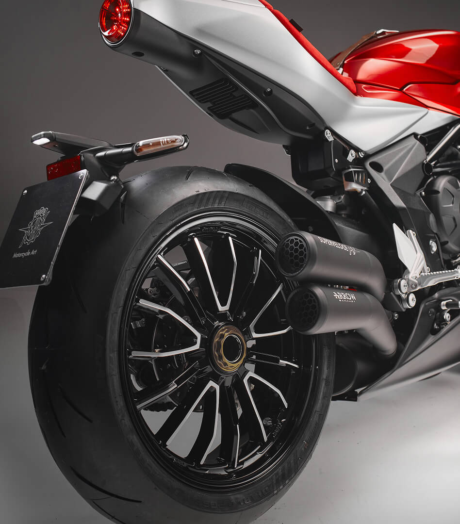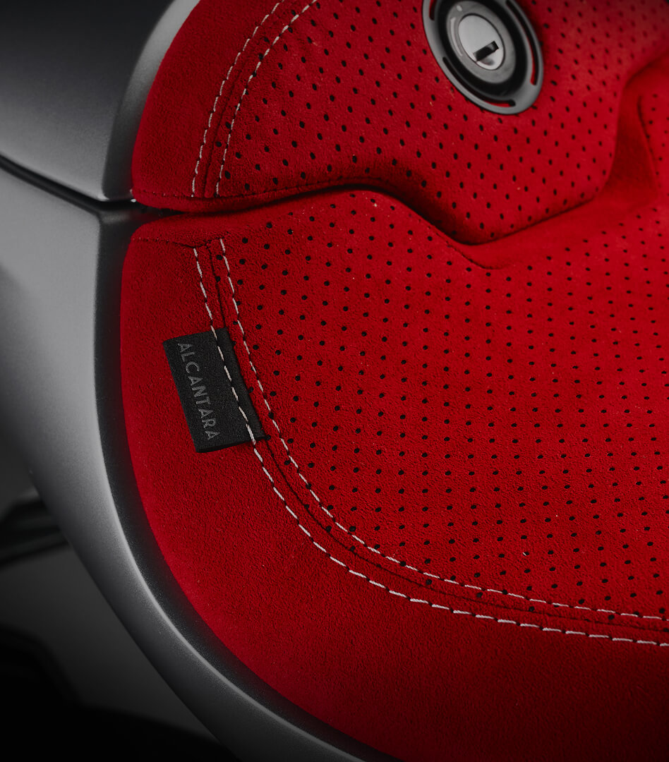 O assento em Alcantara valoriza uma moto que cativa pelo estilo, design e qualidade de construção. A Superveloce S vem equipada com um kit dedicado que inclui uma cobertura de assento para passageiro a condizer com o esquema de cores da moto, juntamente com um escape Arrow de 3 vias que aumenta a potência para 153 HP.