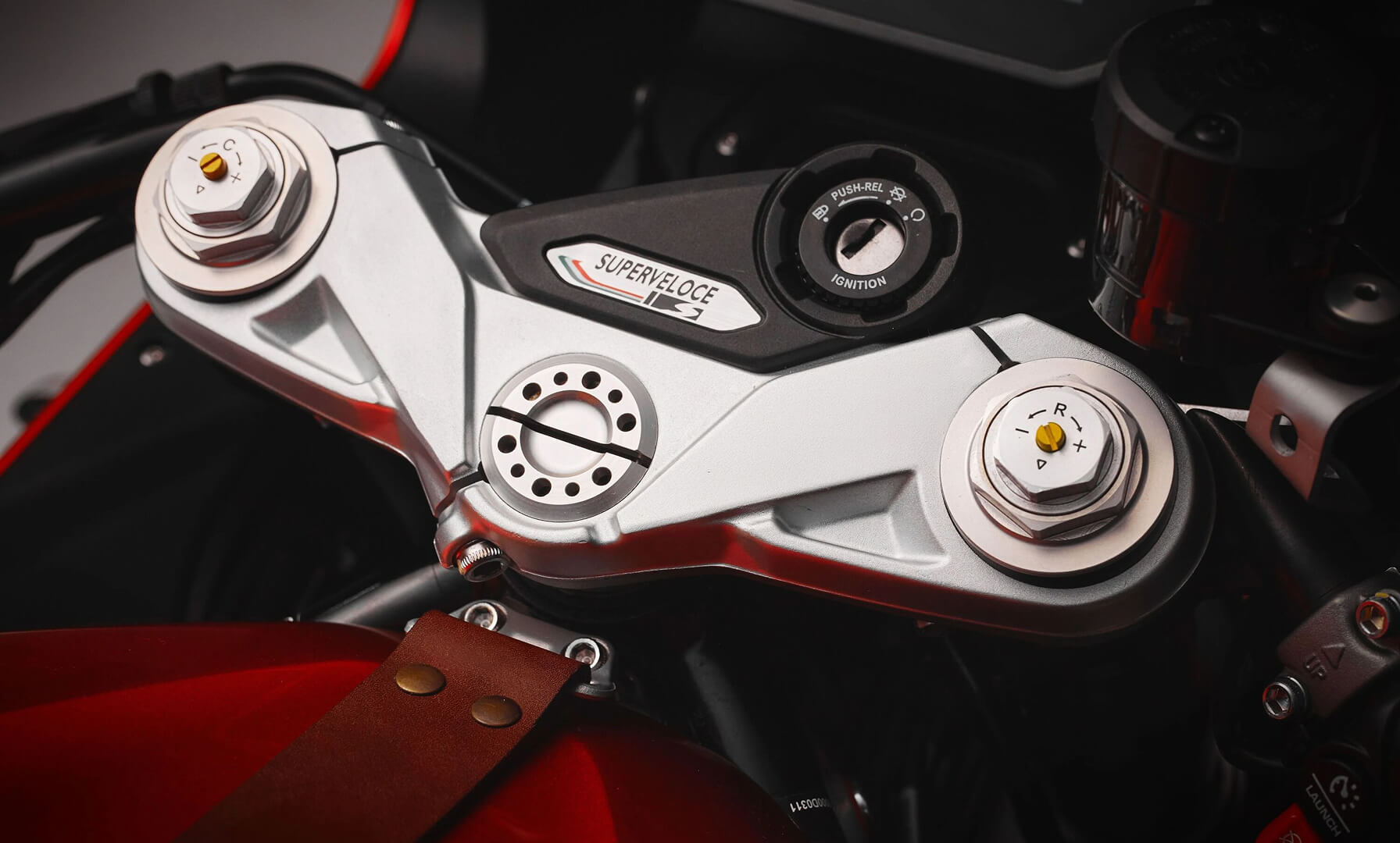 Cada detalhe da Superveloce S foi desenvolvido com o máximo cuidado e refinamento para levar o luxo ao mais alto nível sobre duas rodas. Um exemplo é o assento em Alcantara, que oferece um toque suave e de elevada qualidade, ou a correia em couro que se estende elegantemente sobre o depósito de combustível como a bracelete de um relógio de alta relojoaria, acrescentando ainda mais exclusividade e beleza à moto.