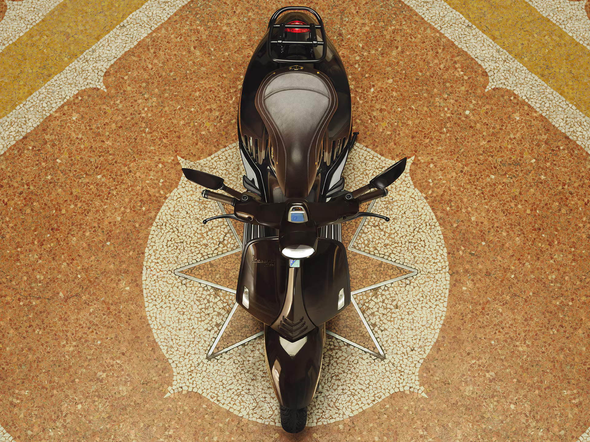 Sob o assento esconde-se um detalhe precioso: uma ferradura dourada que envolve o “V” de Vespa. Um símbolo discreto, quase íntimo, que transporta consigo um desejo de sorte e um sentido de exclusividade.